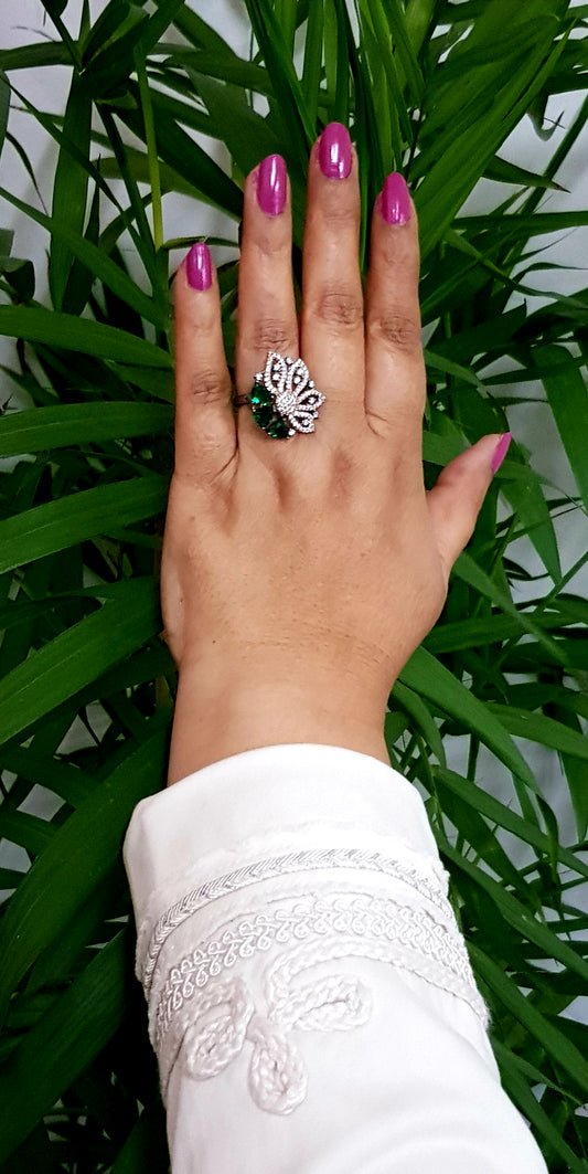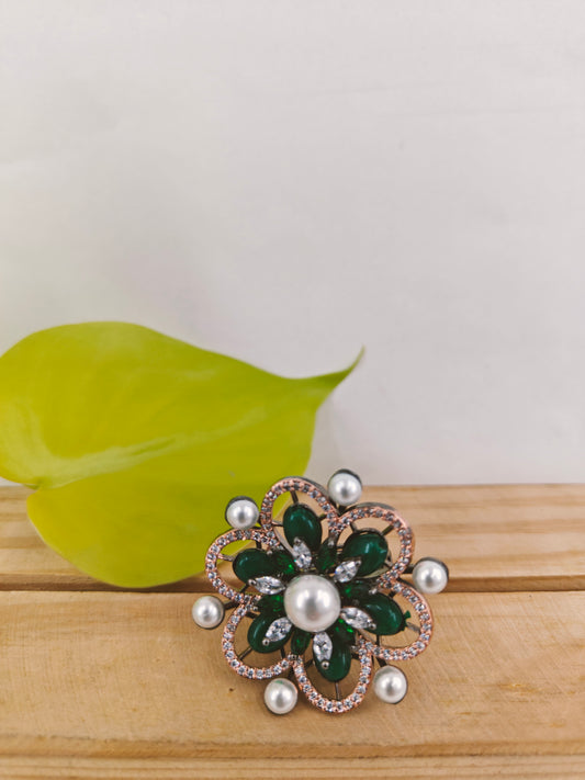 Antique platinum finish ring with emerald green stones,pearls and CZ