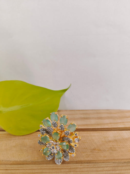 Gold finish ring with mint green and CZ flower design