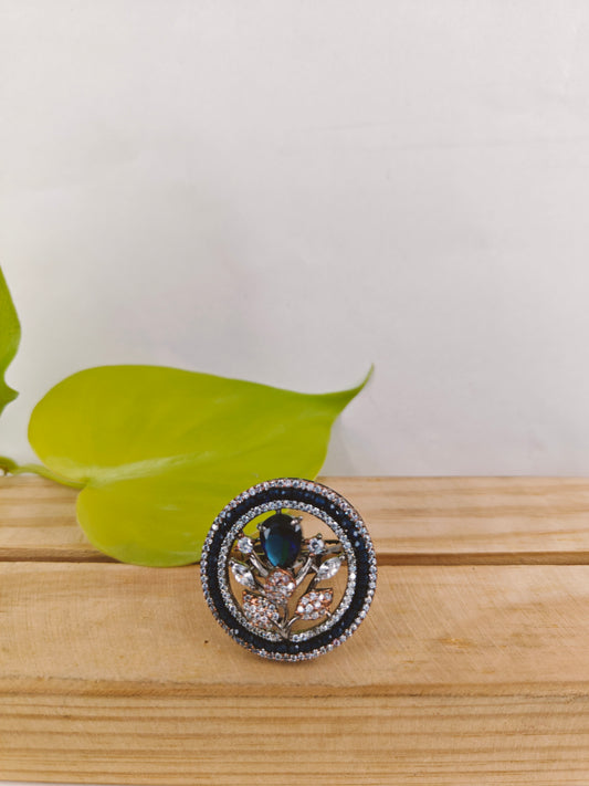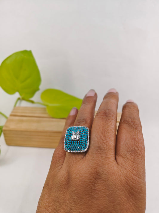 Antique platinum finish ring in turquoise blue/ ruby pink nano stones with CZ highlights