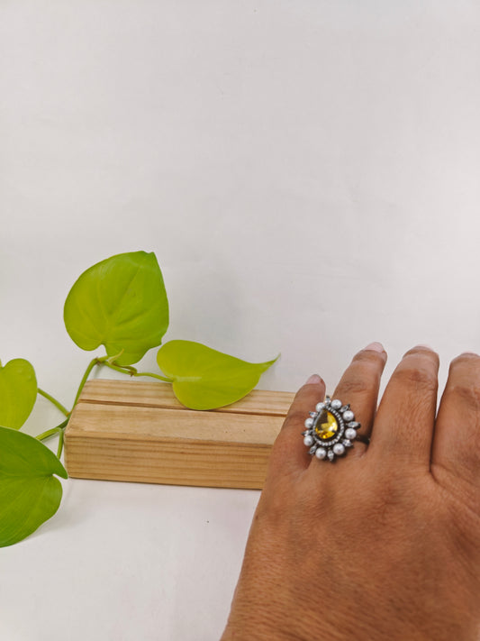 Antique platinum finish ring with teardrop yellow topaz surrounded with CZ and pearls