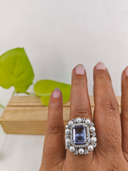 Silver finish amethyst rectangular ring surrounded with CZ and pearls
