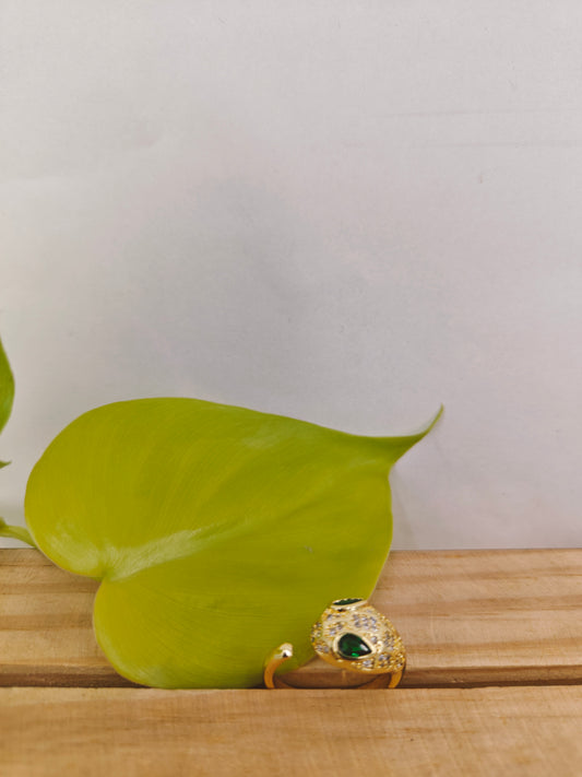 Gold finish snake ring with green eyes and CZ highlights