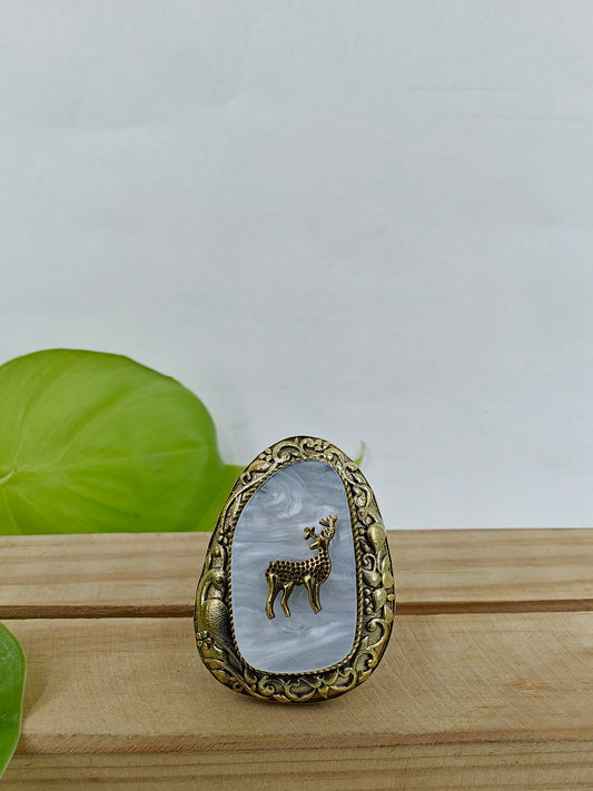 Ring with mother of pearl inlay with reindeer on top