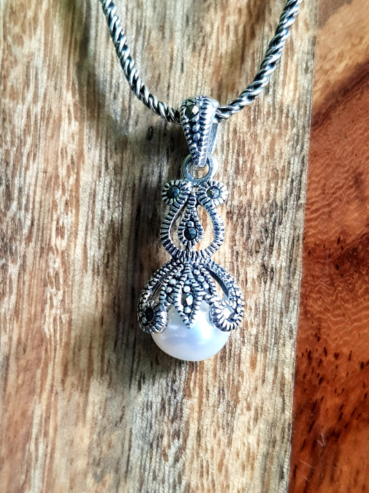 Silver pendant and earrings set with enclosed pearls design and marcasite