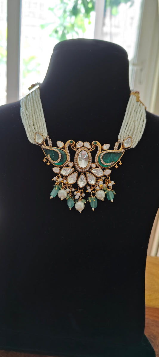 Dyanita choker set on poth pearl strings with mint green stones with work