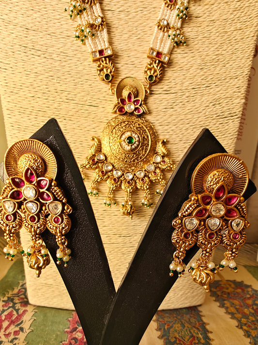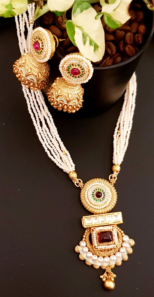 Gold finish set with stone,meenakari and kundan pendant in poth pearl strings with stunning matching jhumkis (earrings)