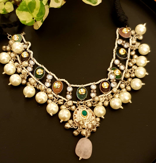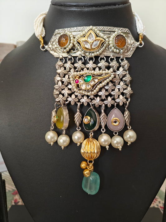 Silver finish choker necklace with kundan on multicoloured stones, poth pearl strings, big pearl drops