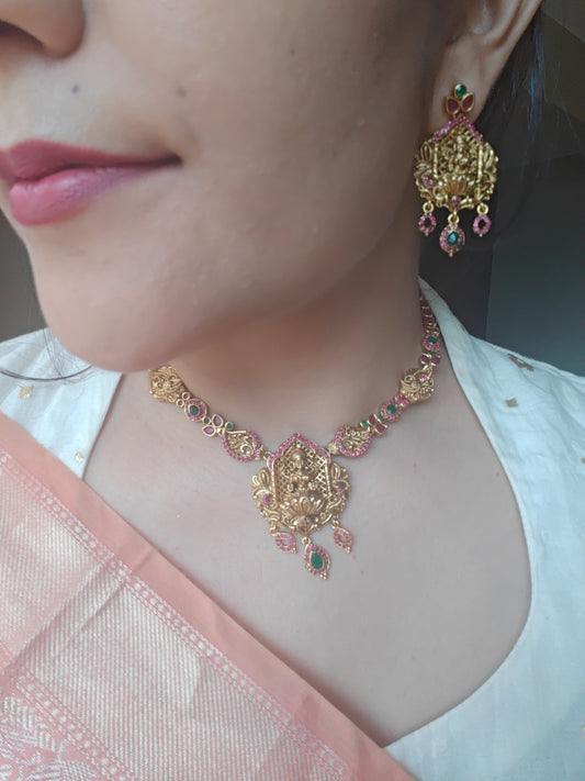 A delicate Temple Jewelry set with Lakshmi pendant with ruby red/CZ stone highlights