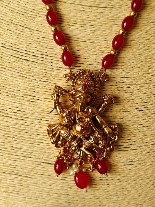 Gold finish Temple set ,carved Ganesha with red stone highlights on red bead necklace.