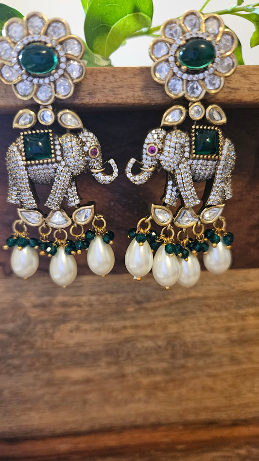 Elephant motif earrings in CZ, kundan, emerald detailing and big pearl hangings