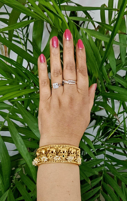 Gold finish broad kara (bangle) with marching elephants and pearl bead cluster (2 pcs