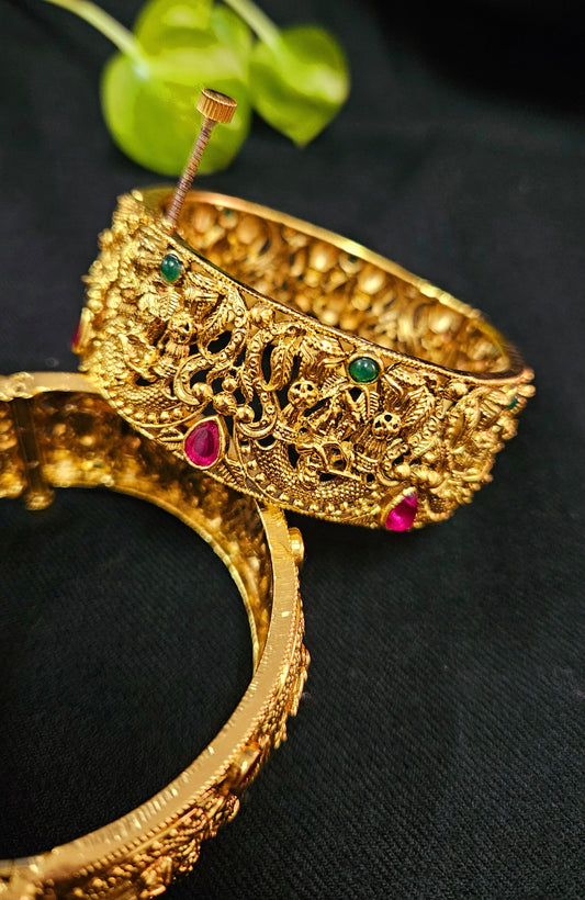 Gold finish temple jewelry kara (bangles) with intricate carving of Krishna playing flute (2 pcs)