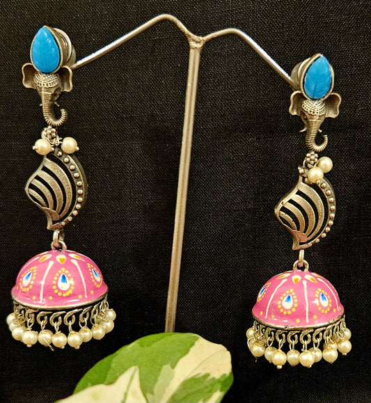 Silver finish jhumka (earrings) with Ganesha head stud and handpainted dome