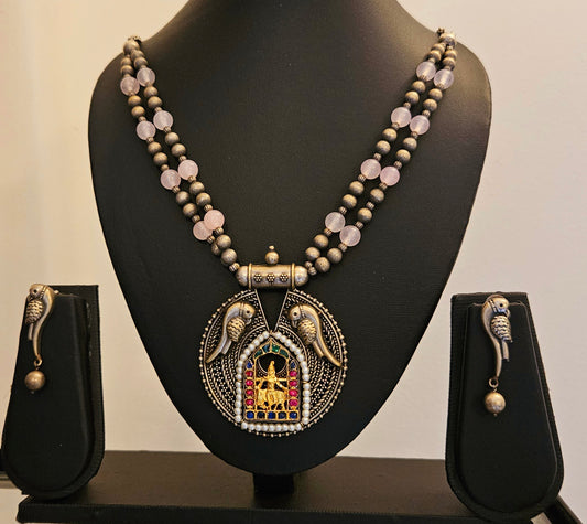 Dual tone set, round pendant with Lakshmi and parrot motif in beads and metal bead necklace, matching parrot studs (earrings)