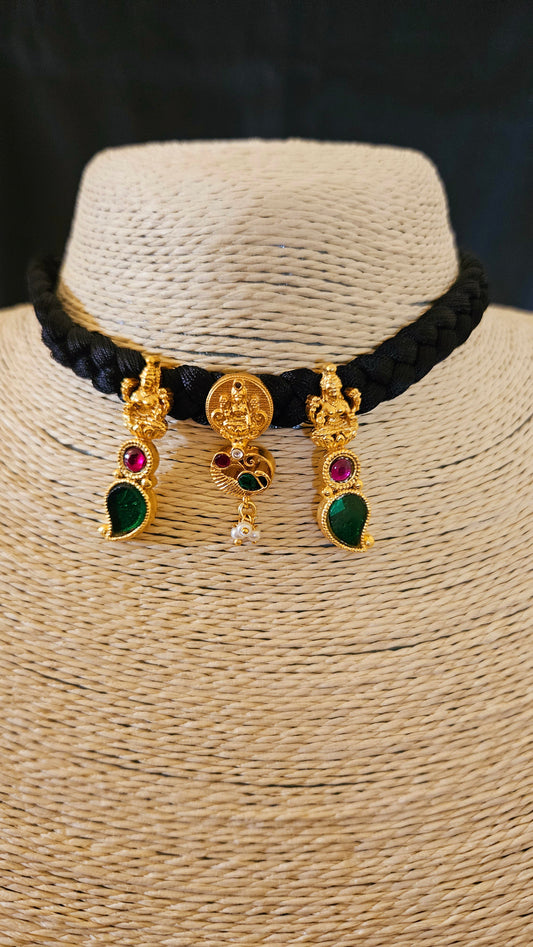 Choker (necklace) with three Lakshmi tikdas on black string