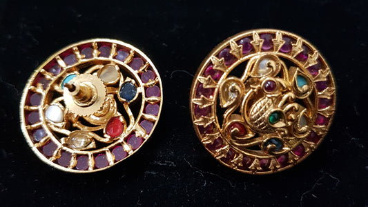 Beautiful round temple jewelry studs (earrings) inlaid with kemp stones and navratan