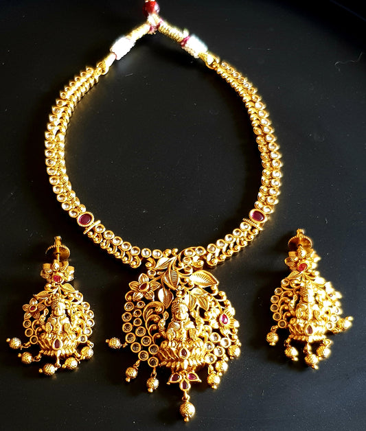 Temple jewelry set, necklace with Lakshmi motif pendant and green/red stones inlay, matching earrings