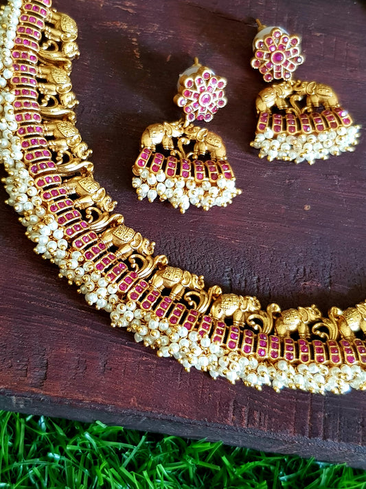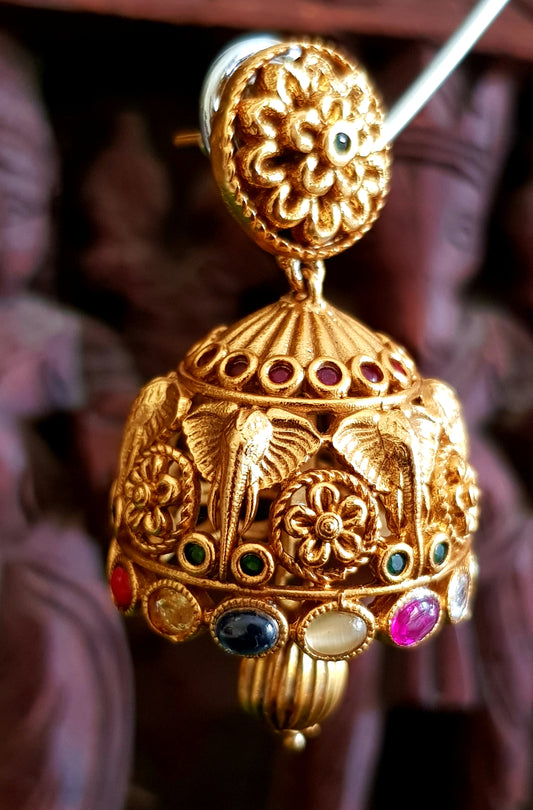 Temple jewelry set, necklace with elephant head design and navratan stones inlay, matching jhumkas (earrings)