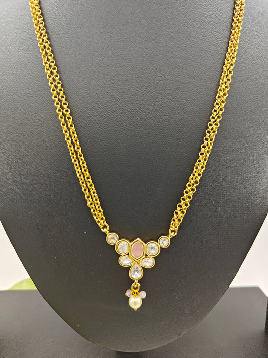 Set with kundan and mint green/baby pink pendant on double gold chains