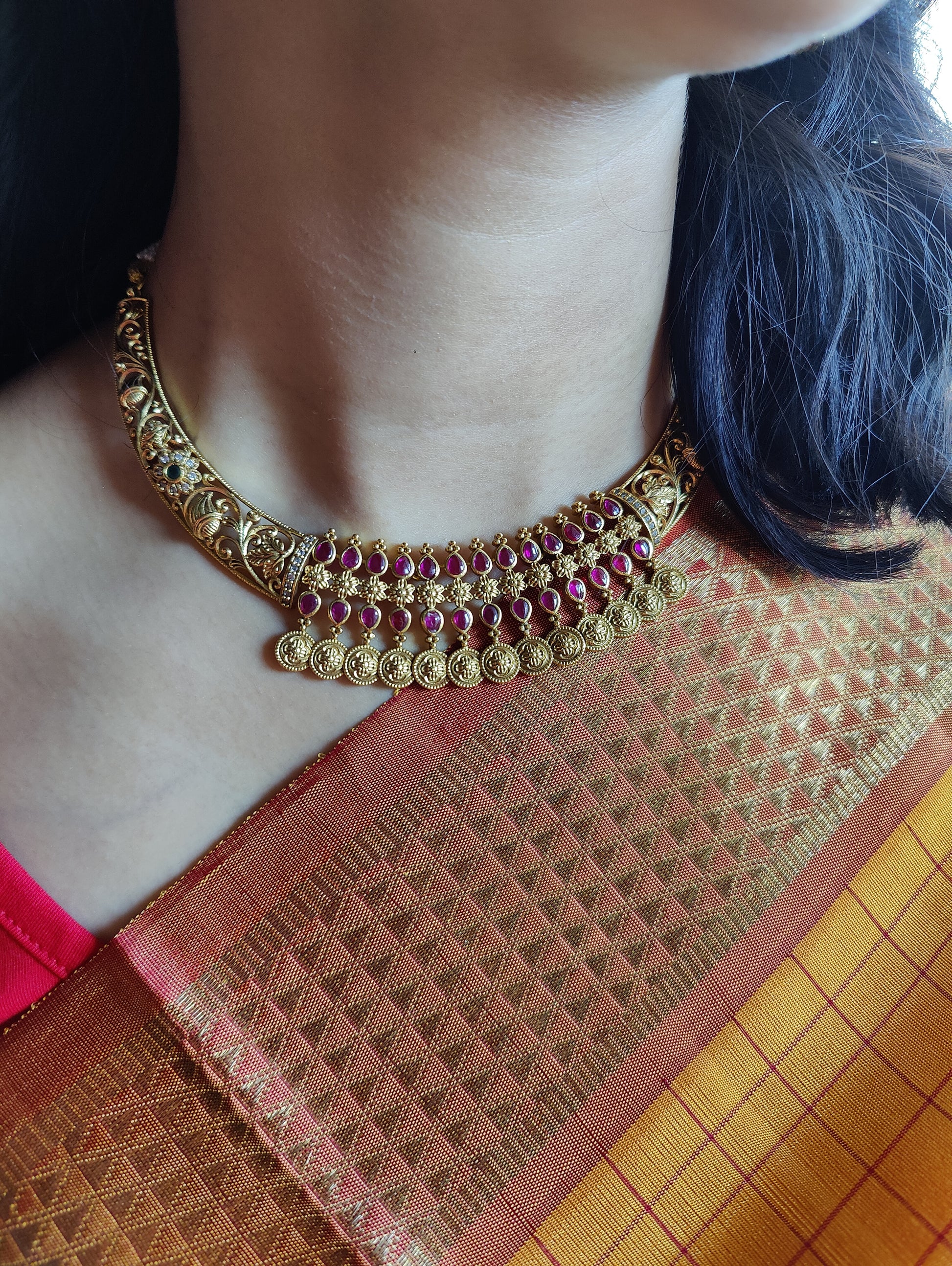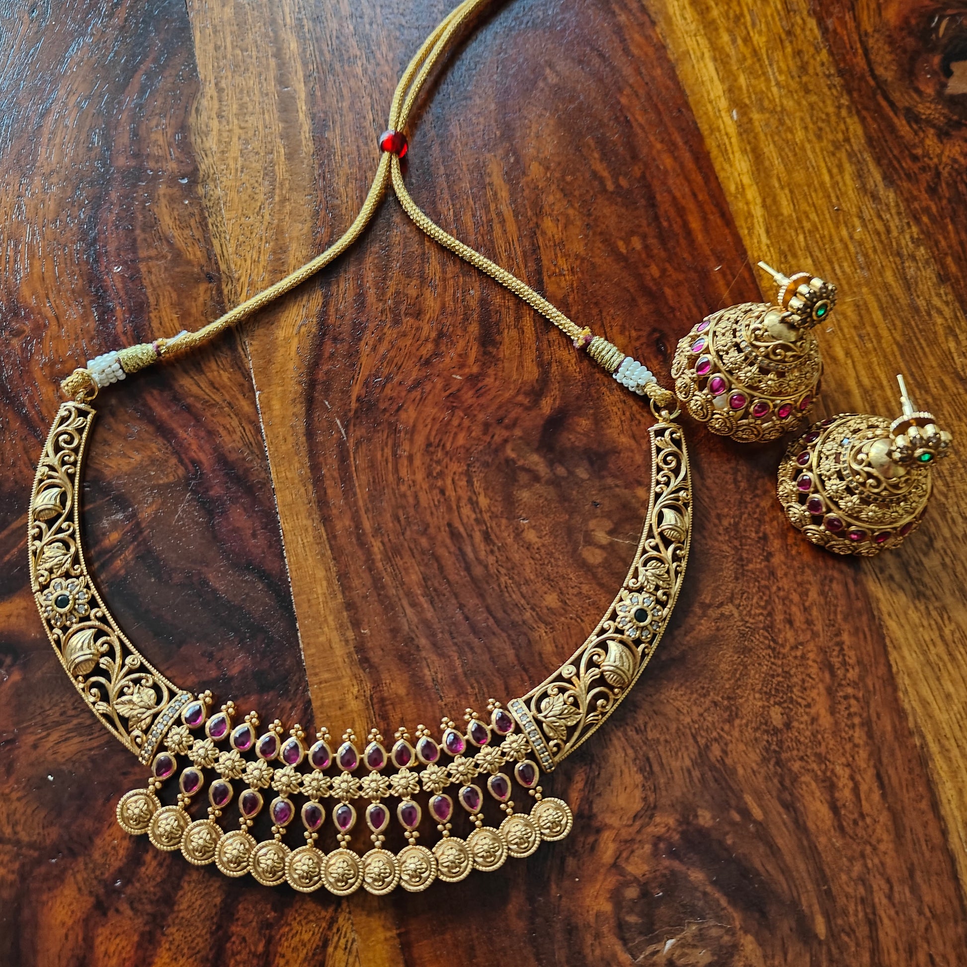 Set has navratan/ ruby stone inlay in the centre piece with Jali hasli on sides .Matching jhumkis accompany the set