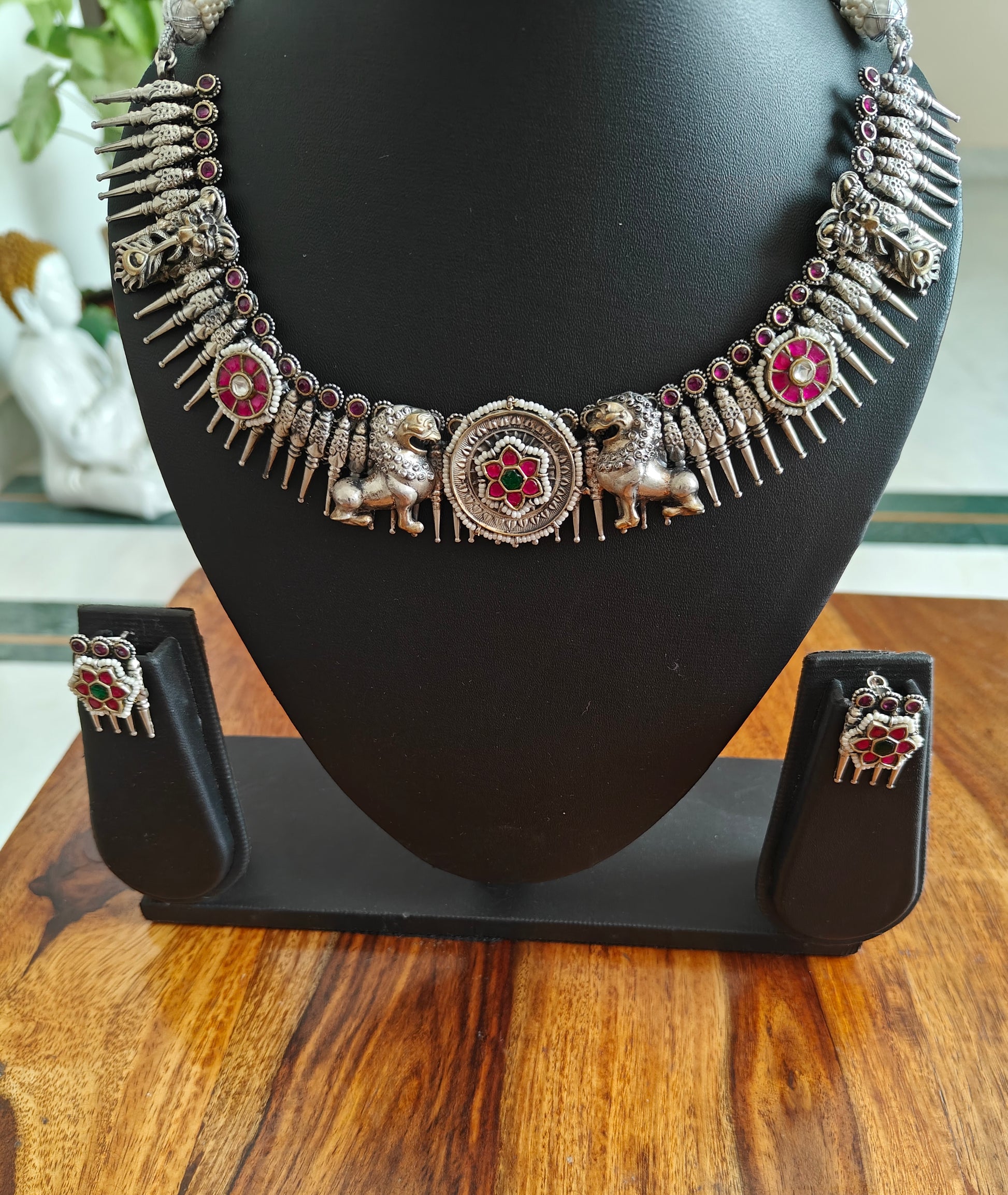 This dual stone set with pegs has lions on rather side of a piece with stone and Matching earrings accompany the set