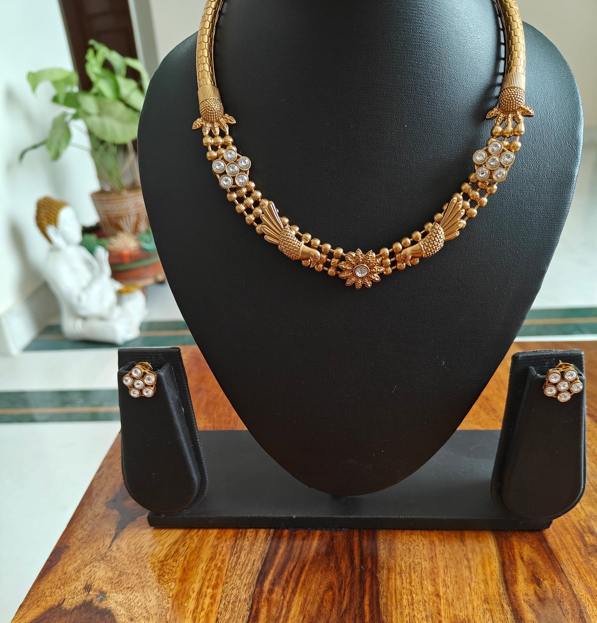This golden set has peacocks and kundan on top of the neckpiece.Kundan flower studs accompany the set