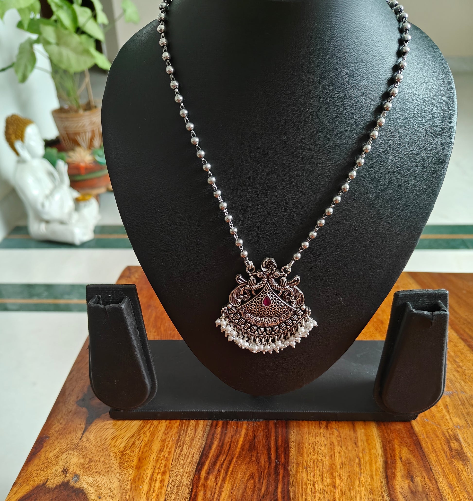 This 92.5 sterling silver necklace has carved peacock design.Pearls and stone enhance it.