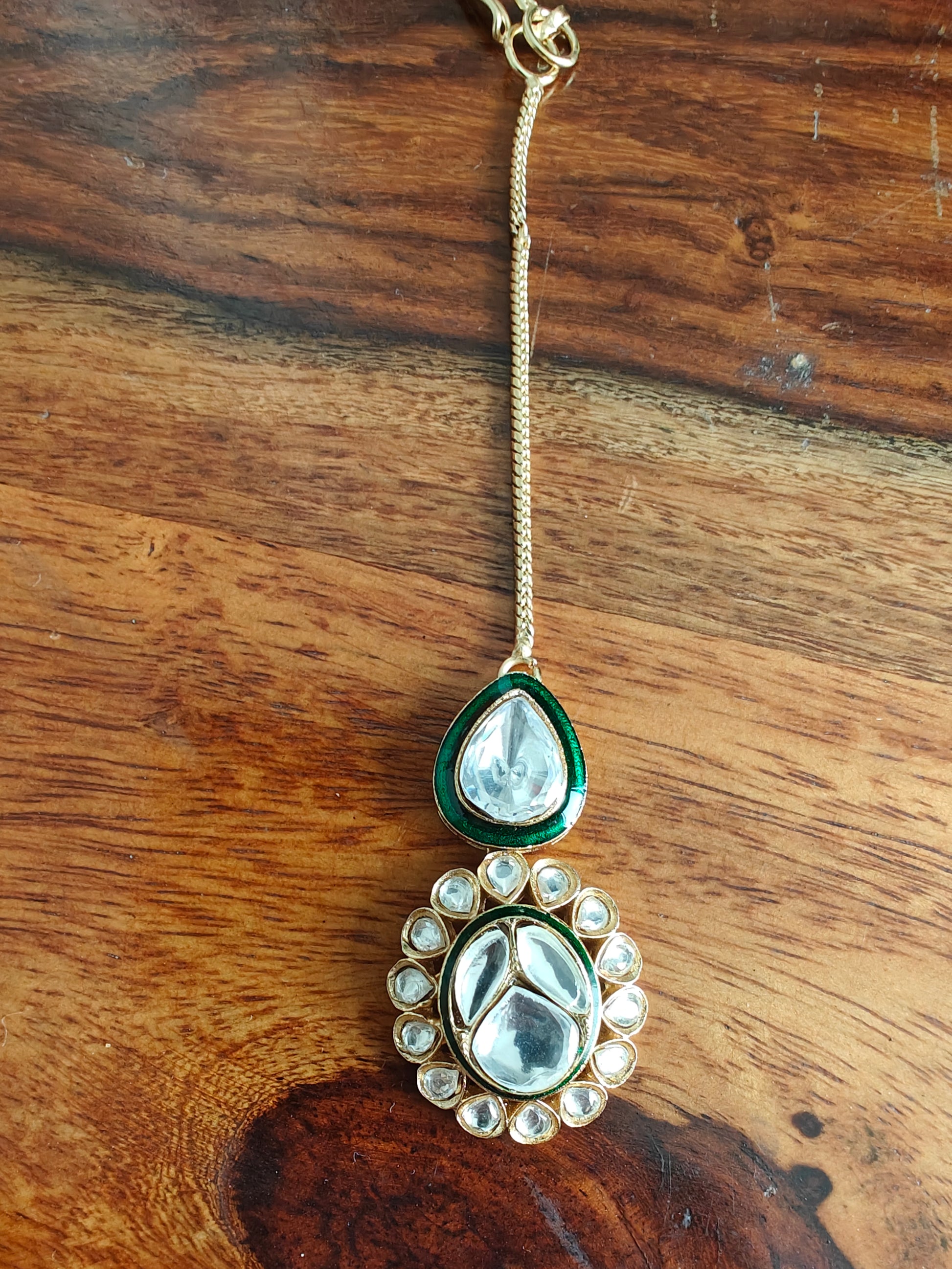 This elaborate choker set has moissanite and green enamel.Mint green hangings are below.A mang tikka accompanies the set.A perfect set for a special occasion