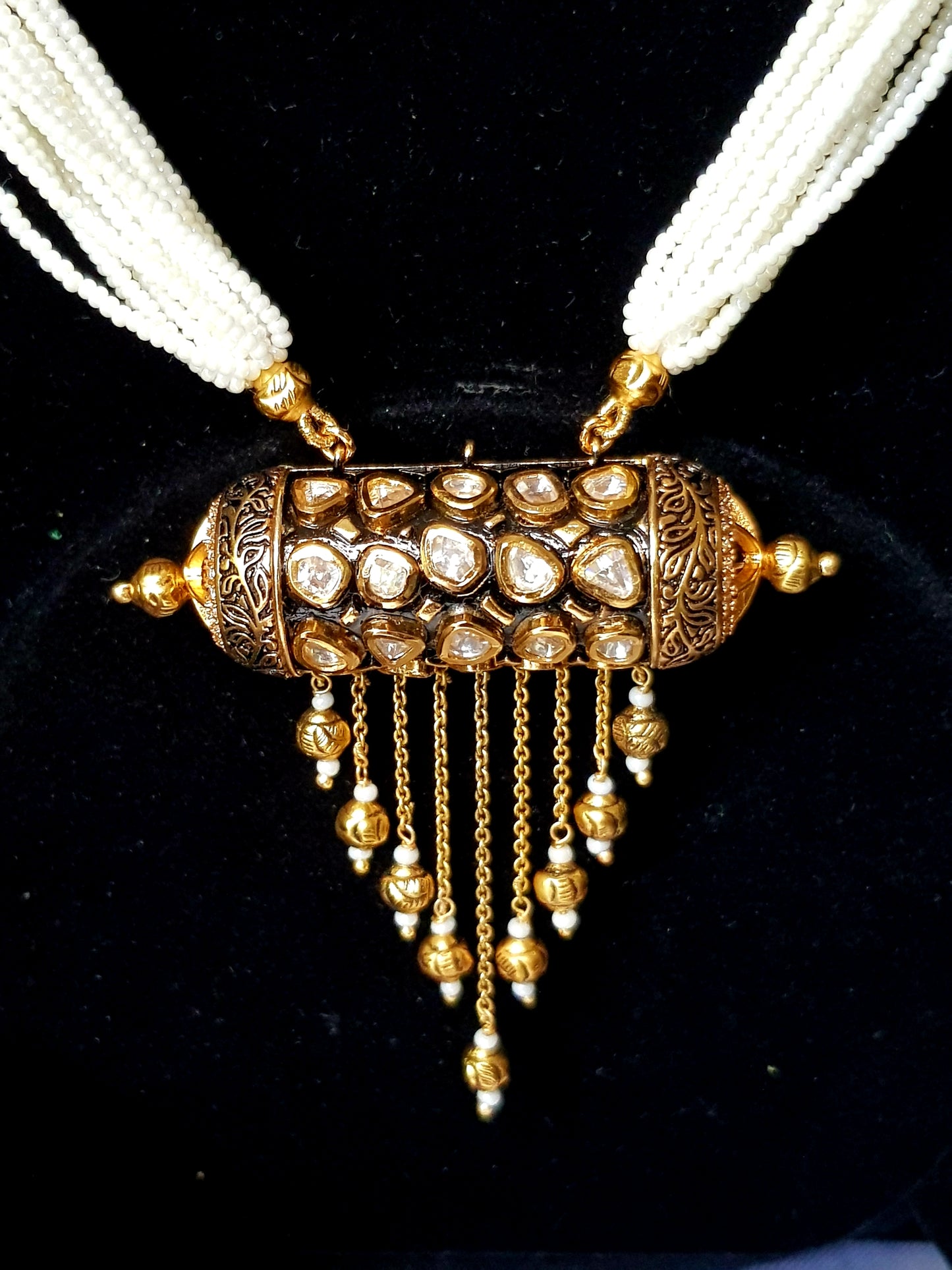 The pearl strings on both sides of an elegant kundan damru shaped pendant with meenakaari and hangings, is a statement long necklace which comes with an adjustable string.