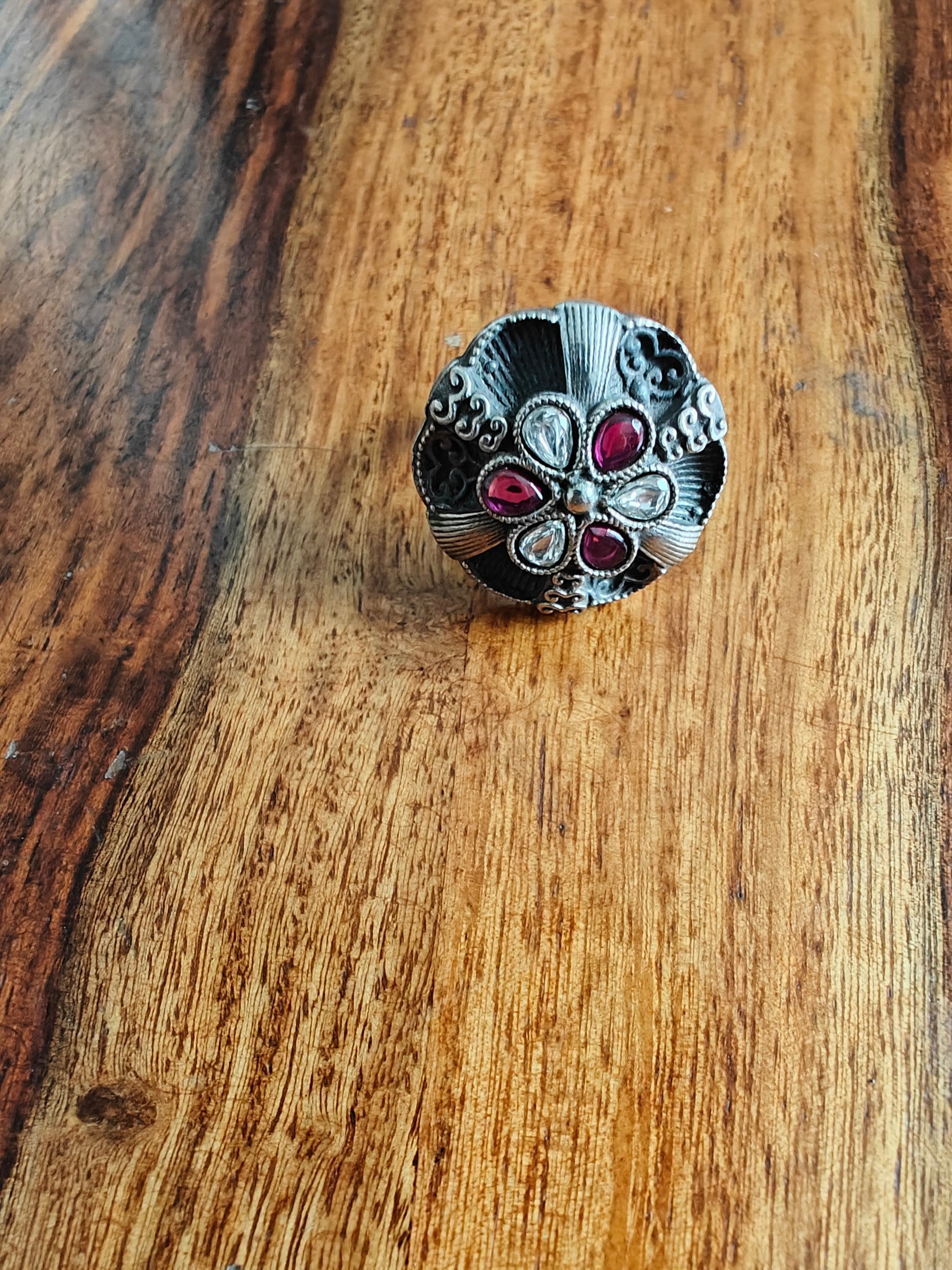Sterling silver ring with ruby red and transparent stone in antique finish