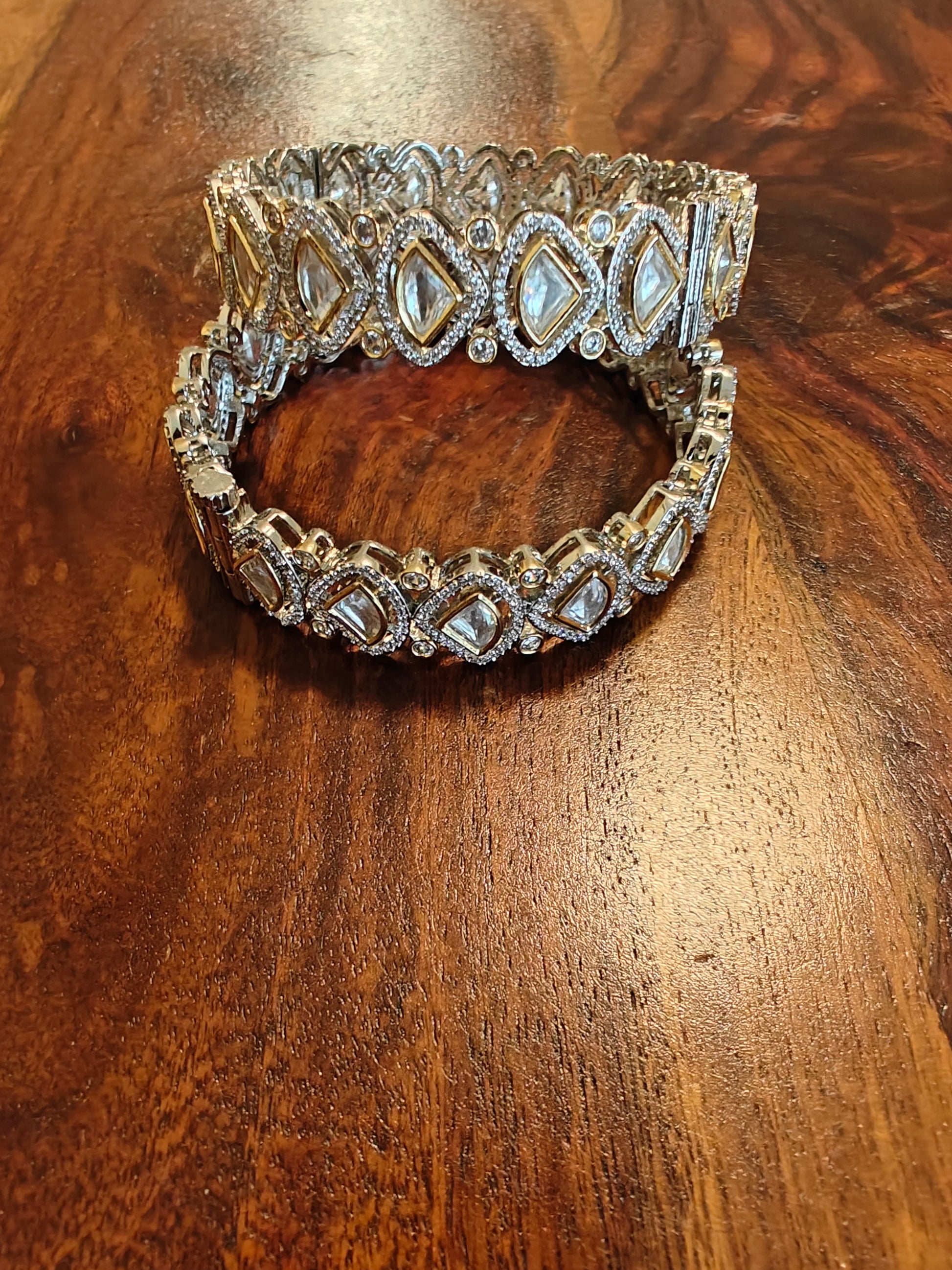 These kundan karas have kundan pieces highlighted with CZ.They have an openable screw design for ease of wearing.