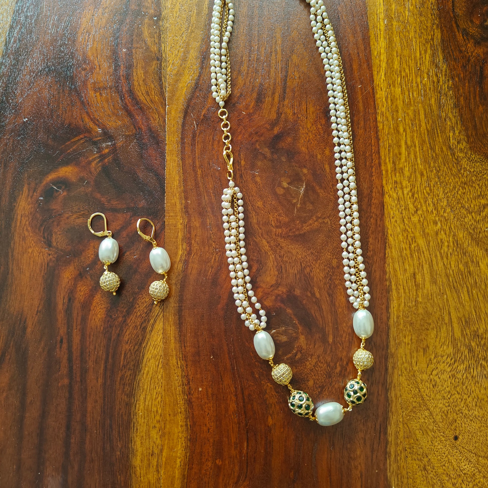 The set has long gold and pearl chains with pearls and worked upon stones.Matching earrings