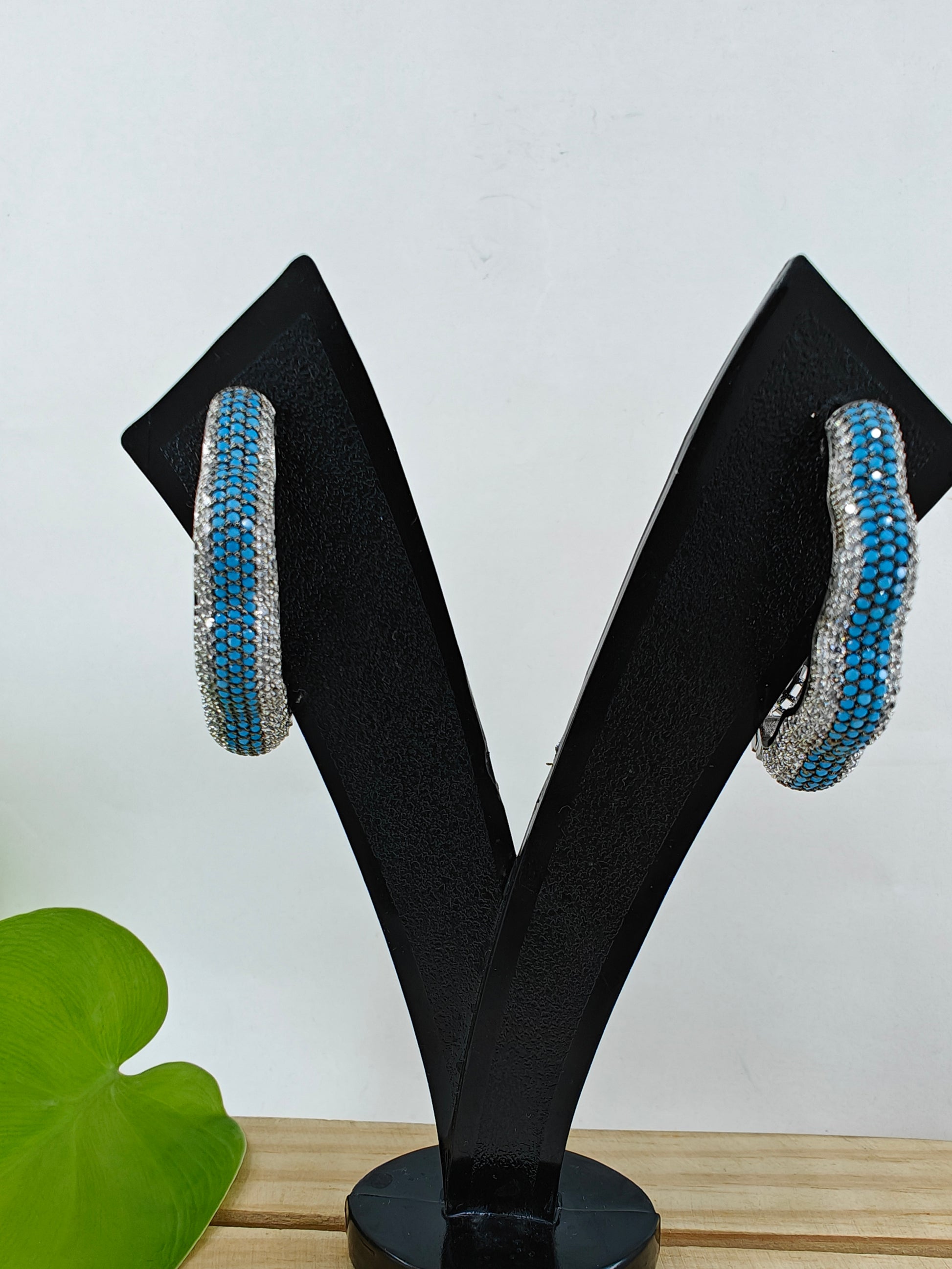 Earrings in platinum finish with nano stones and CZ highlights.The earrings have acurved hoop pattern .